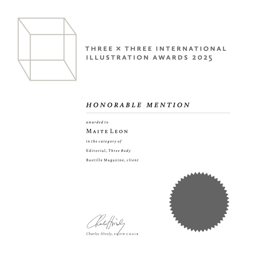 This illustration received an Honorable Mention at the 3×3 International Illustration show n°22 (2025), in the Professional Editorial category and will be featured in the 3×3 International Illustration Annual n°22 and on their Online Gallery.